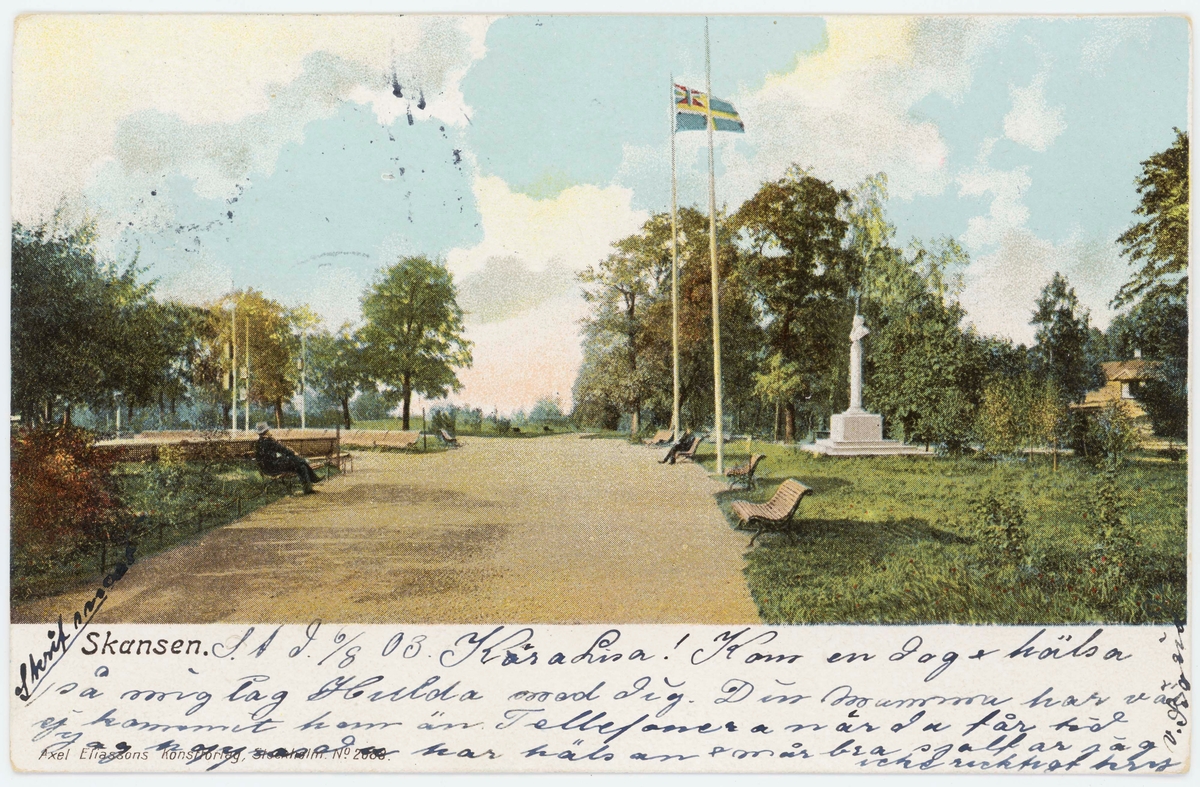 Titel: Vykort med motiv från Skansen. Parkliknande vy med bred grusväg. Byst. Unionsflagga. Parkbänkar.