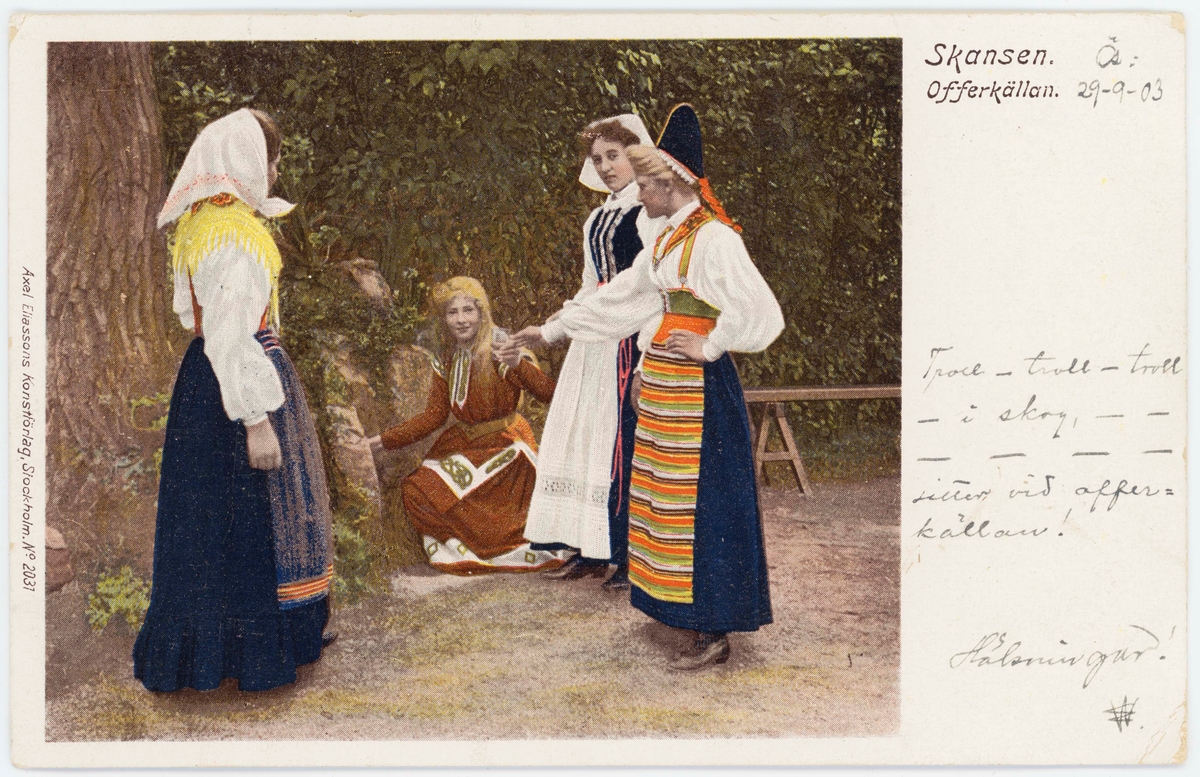 Vykort med motiv från Skansen. "Offerkällan". Fyra kvinnor vid "offerkälla", tre i folkdräkt, en i historiserad dräkt