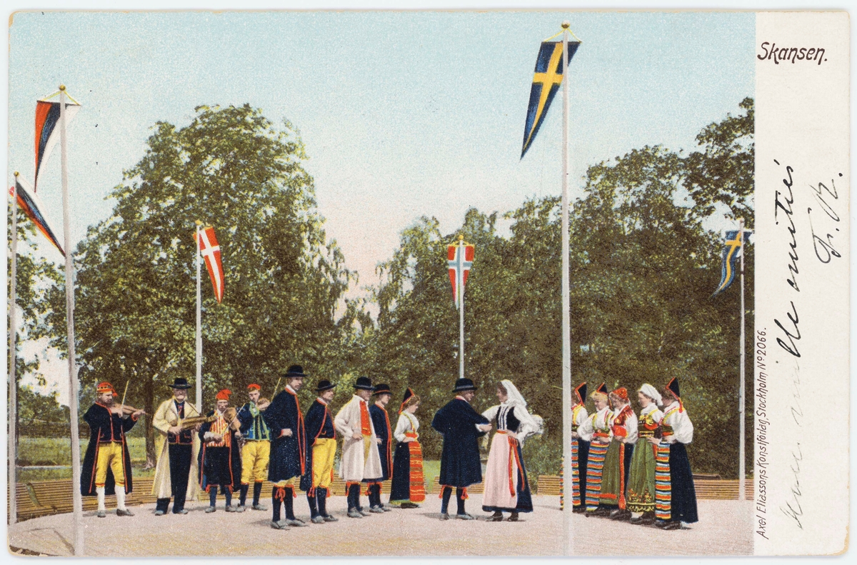 Titel: Vykort med motiv från Skansen. Folkdansuppvisning.