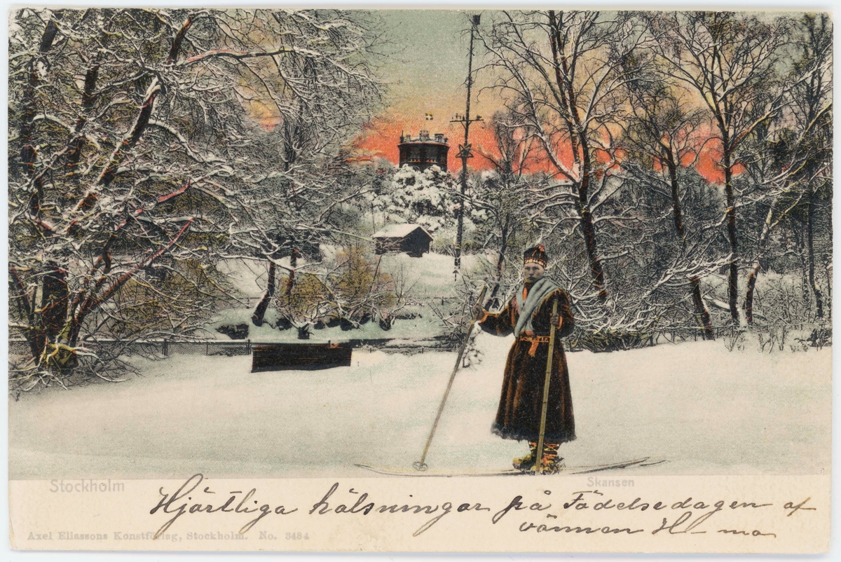 Titel: Vykort med motiv från Skansen. Man klädd i samisk dräkt på skidor.
