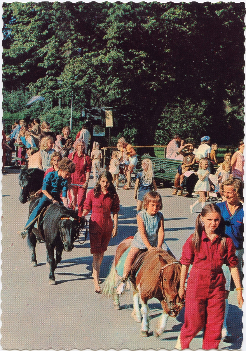 Titel: Vykort med motiv från Skansen. "Ridturer för barn." Ponnyridning. Shetlandsponny.