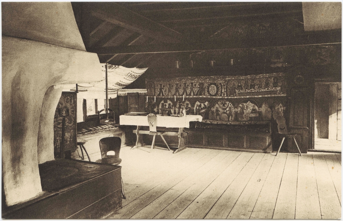 Titel: Vykort med motiv från Skansen. Kyrkhultsstugan, interiör med spisen i förgrunden.