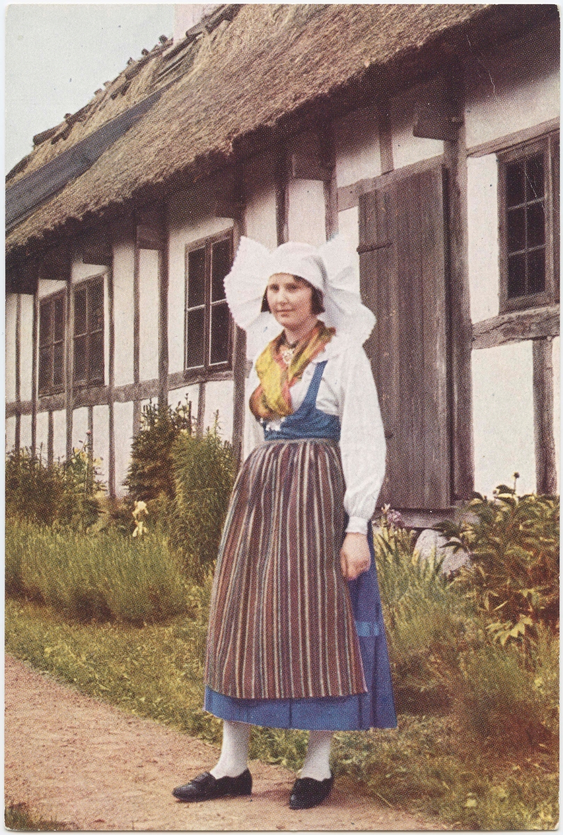 Vykort med motiv från Skansen. "Helgdagsdräkt för hustru. Oxie härad, Skåne. Vid Ravlundagården."