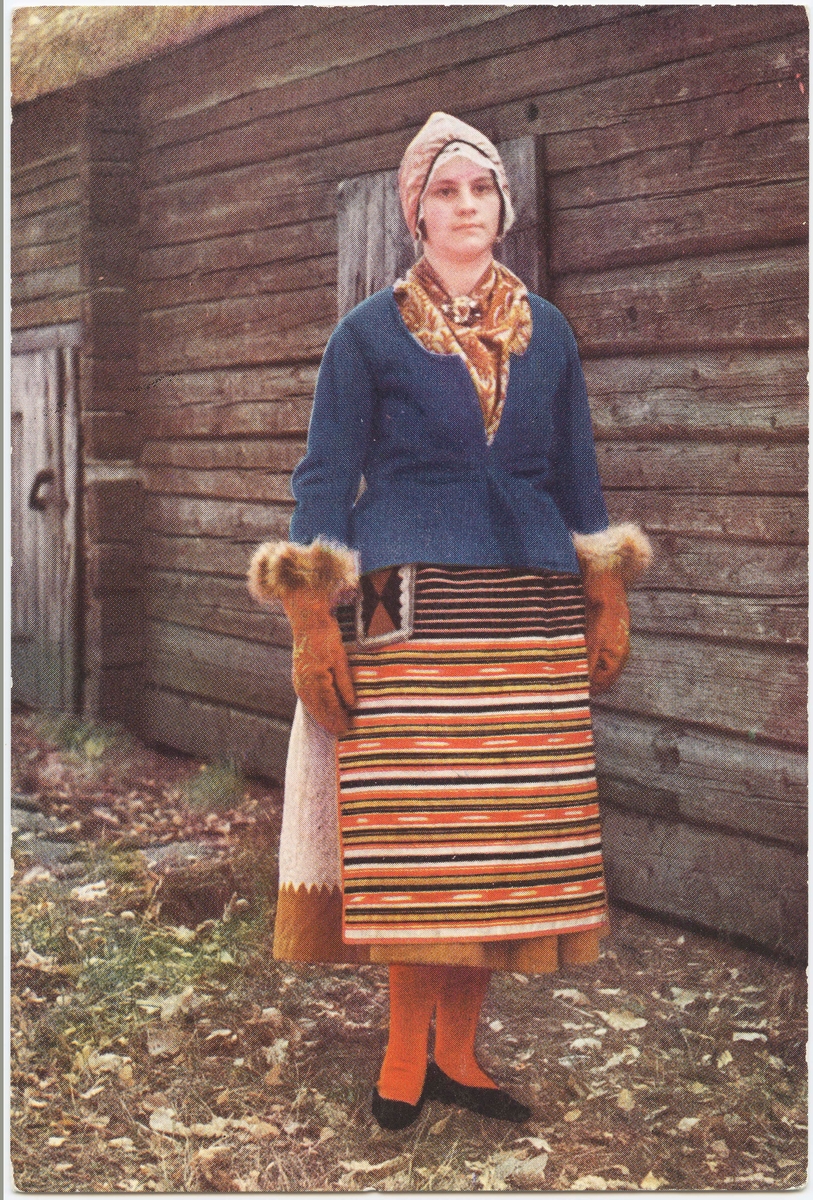 Vykort med motiv från Skansen. "Vinterhelgdagsdräkt för hustru. Unnaryds socken, Småland. Vid Soldattorpet."