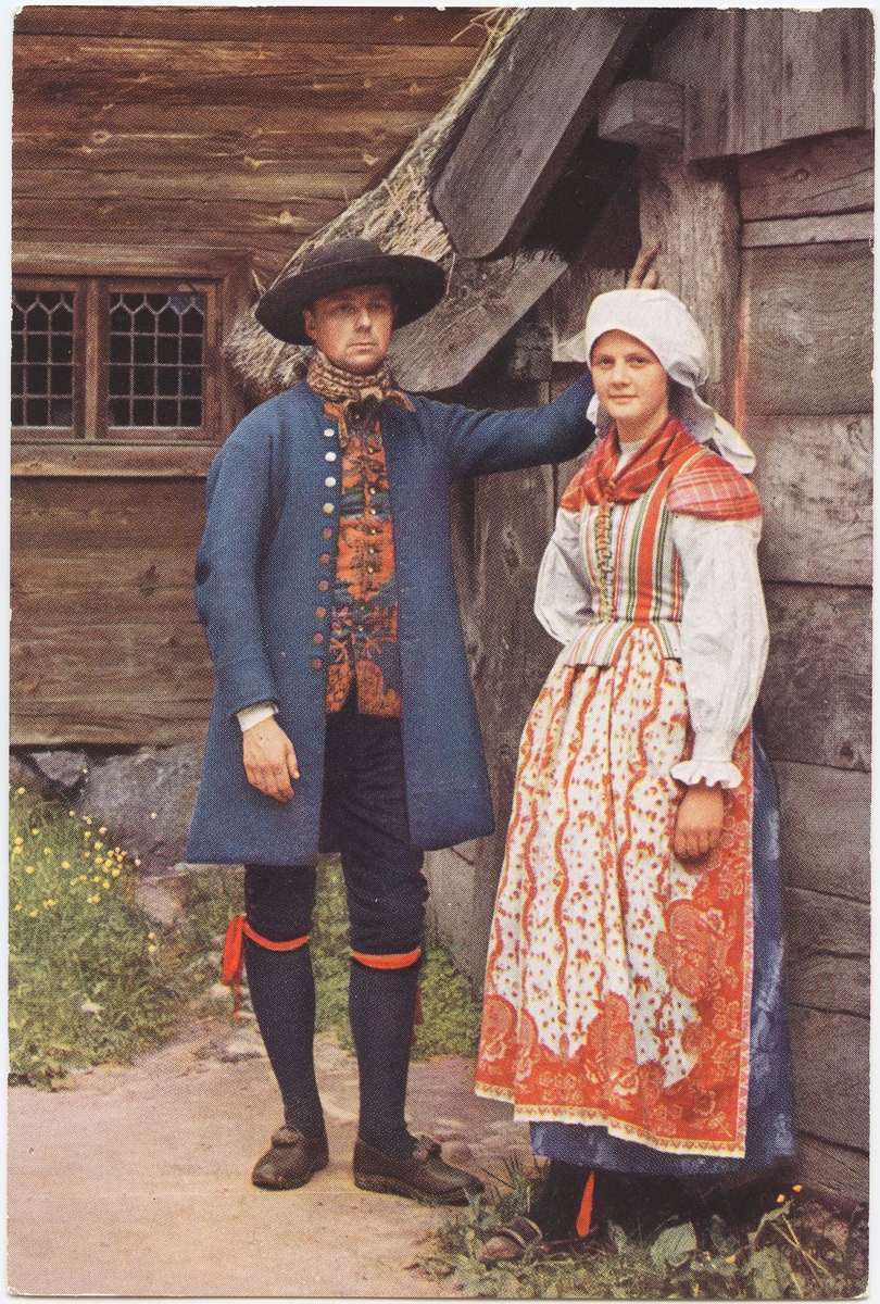Vykort med motiv från Skansen. "Helgdagsdräkter. Årstads härad, Halland. Vid Oktorpsgården."