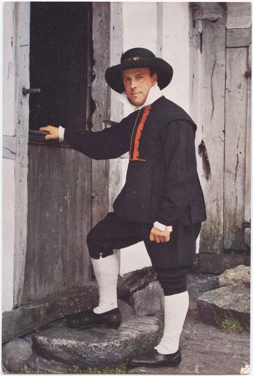 Vykort med motiv från Skansen. Helgdagsdräkt. Ingelstads härad, Skåne. Vid Ravlundagården."