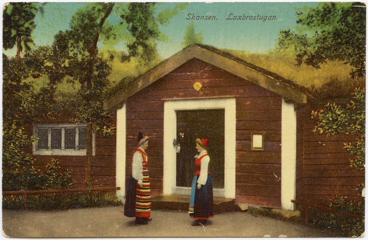 Titel: Vykort med motiv från Skansen. Två kvinnor i folkdräkt framför Laxbrostugan.