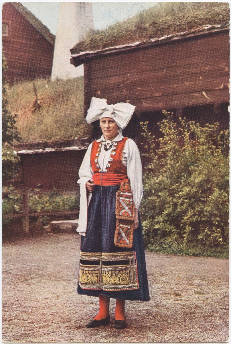 Vykort med motiv från Skansen. "Högtidsdräkt för hustru. Värend, Småland. Vid Kyrkhultsstugan."