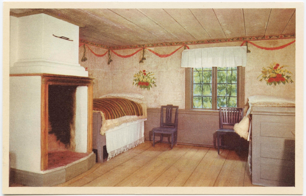 Titel: Vykort med motiv från Skansen. Delsbogården från Hälsingland.