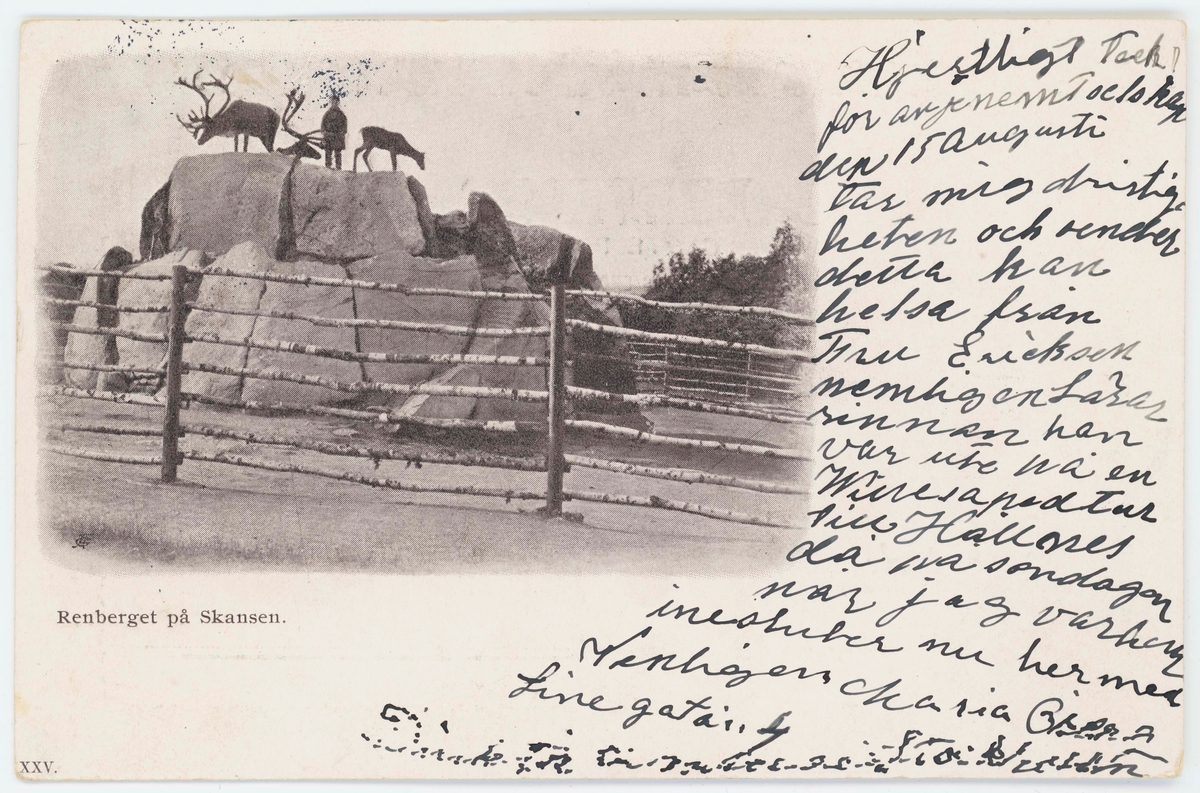 Titel: Vykort med motiv från Skansen. "Renberget på Skansen".
