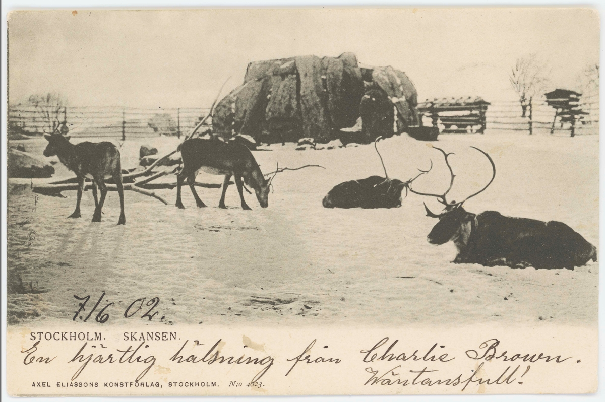 Titel: Vykort med motiv från Skansen. Renar vid renberget på Skansen.