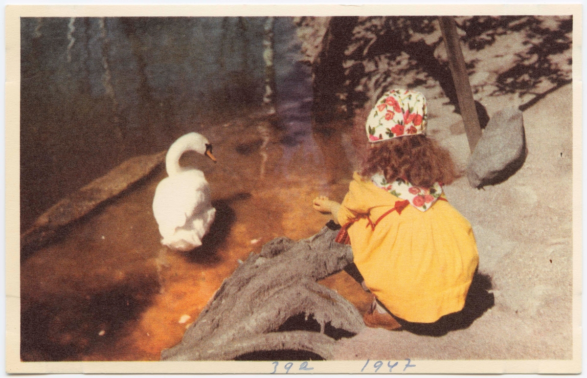Titel: Vykort med motiv från Skansen. "Vid svandammen." Liten flicka och en svan.