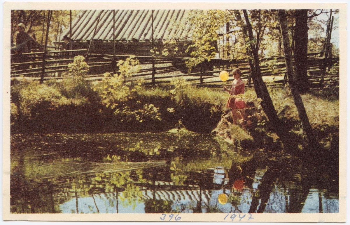 Titel: Vykort med motiv från Skansen. "En solig vrå." Flicka med gul ballong vid svandammen.