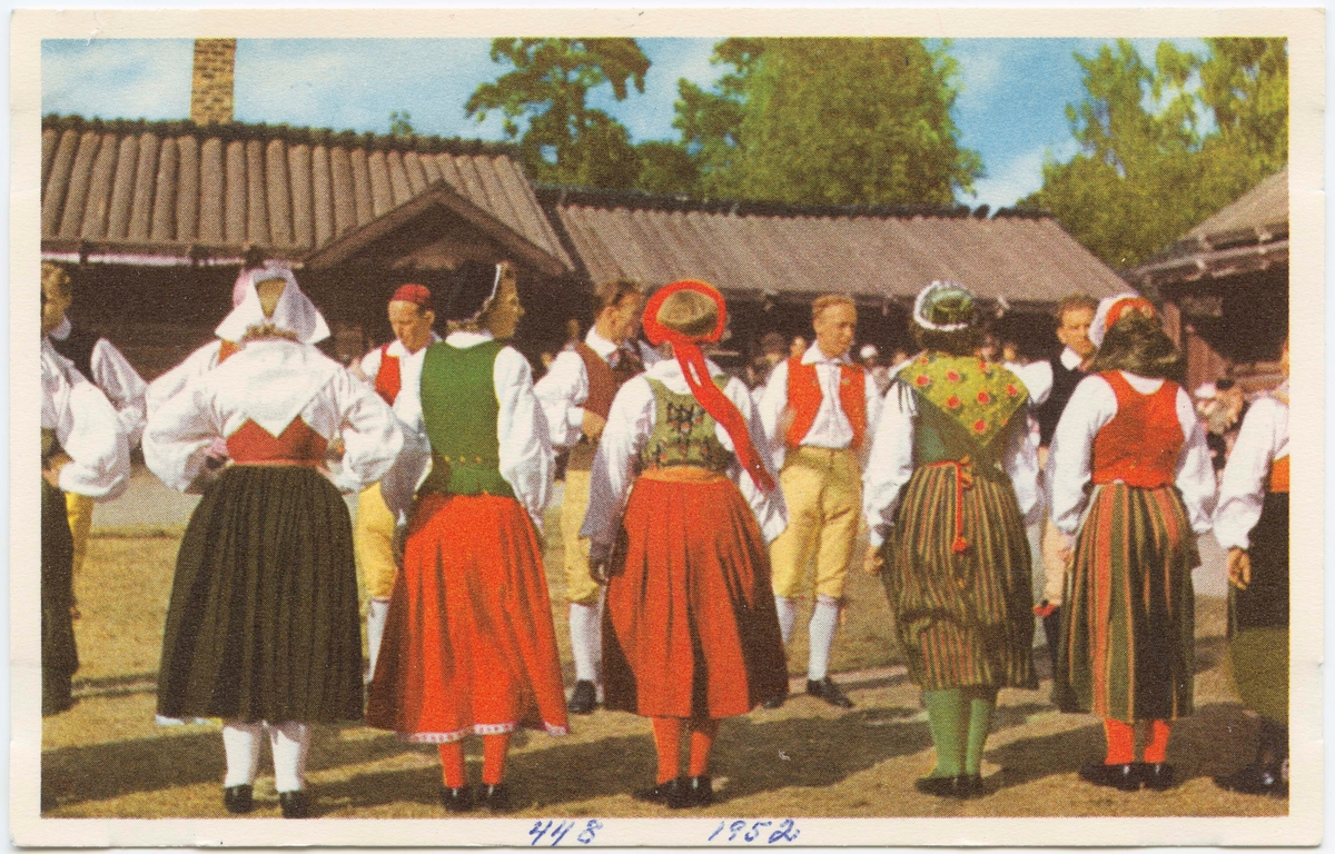 Titel: Vykort med motiv från Skansen. Folkdans på Moragården.