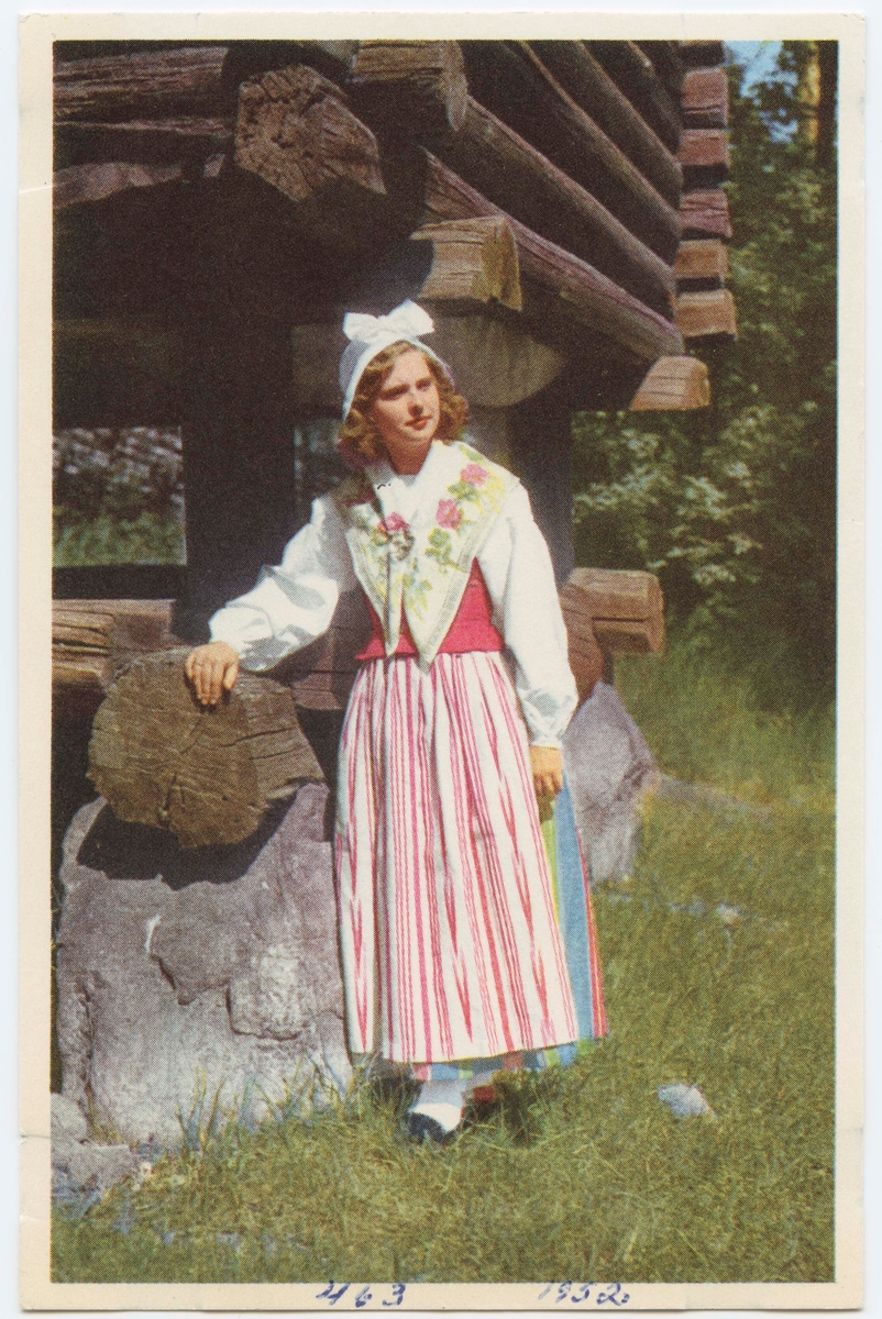 Vykort med motiv från Skansen. "Dräkt från Östervallskog, Värmland."
