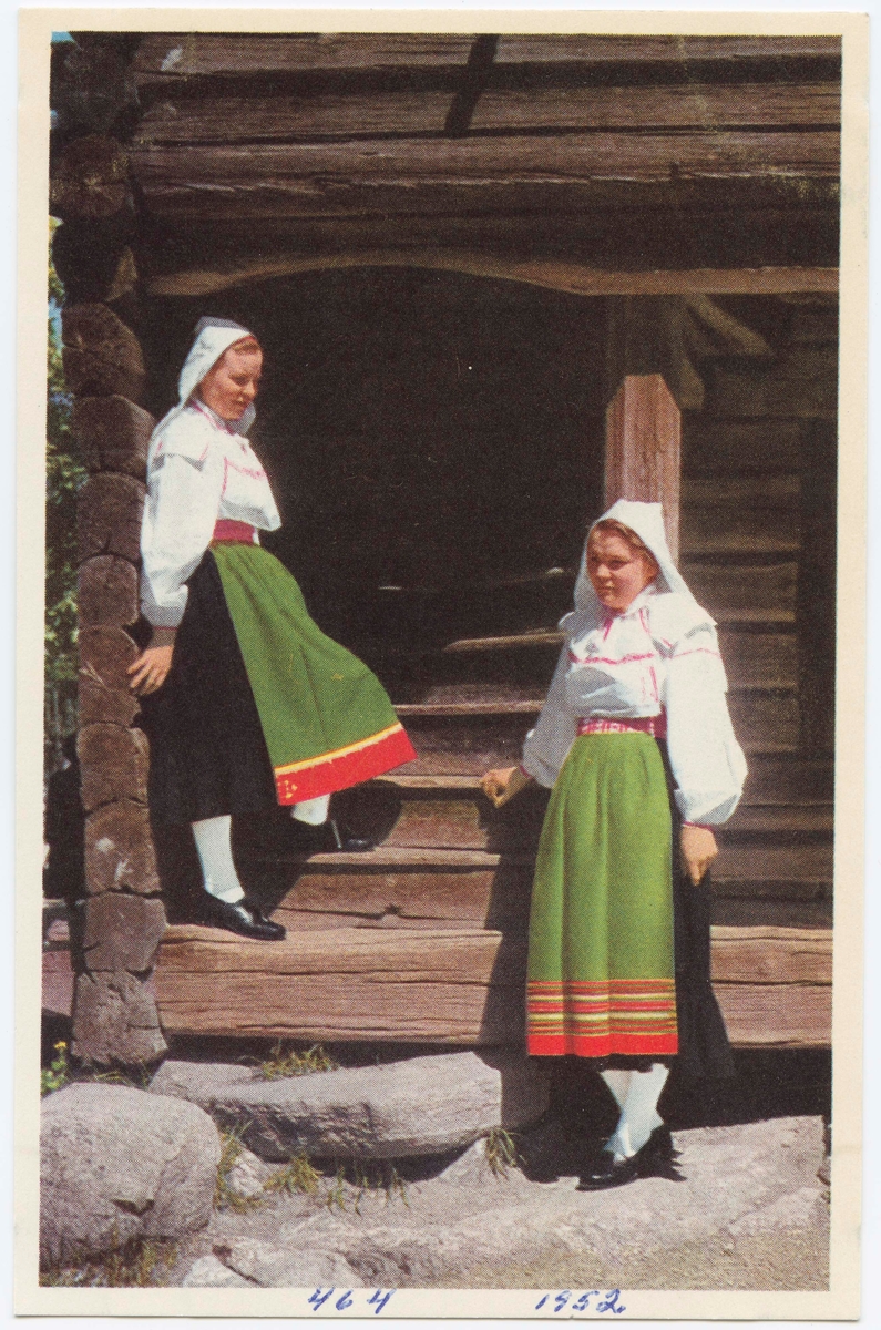 Vykort med motiv från Skansen."Dräkt från Mora, Dalarna."