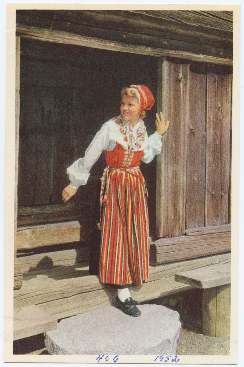 Vykort med motiv från Skansen. "Dräkt från Leksand, Dalarna."
