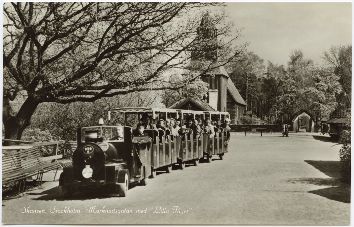 Titel: Vykort med motiv från Skansen. "Marknadsgatan med Lilla Tåget."
