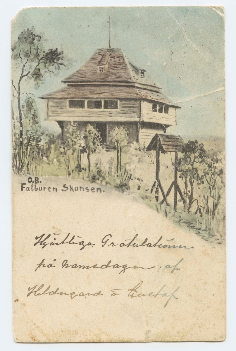 Titel: Vykort med motiv från Skansen. Förrådsbyggnaden Fatburen.