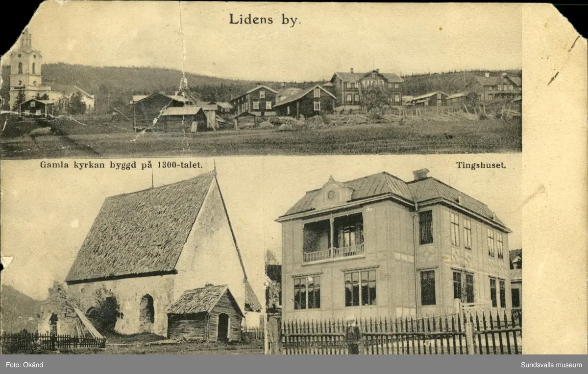 Vykort med motiv över byn, gamla kyrkan och tingshuset i Liden.