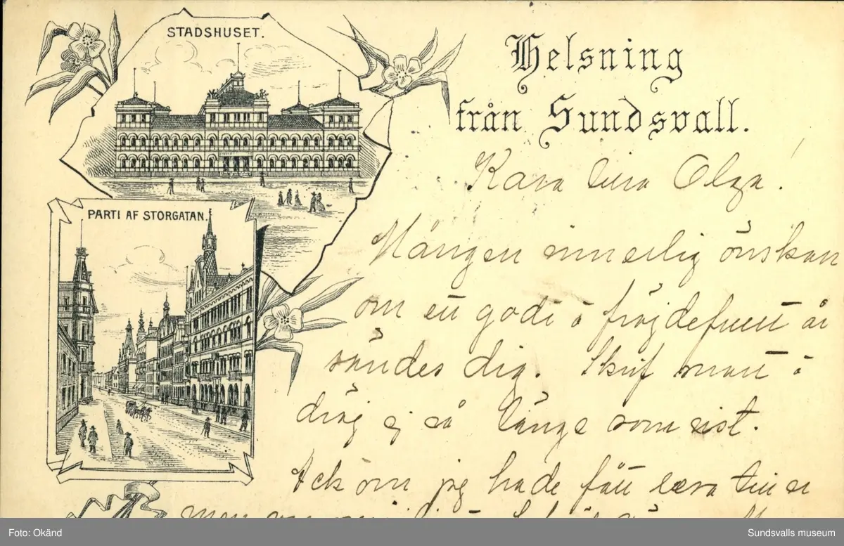 Vykort med motiv över Stadshuset och parti av Storgatan i Sundsvall.