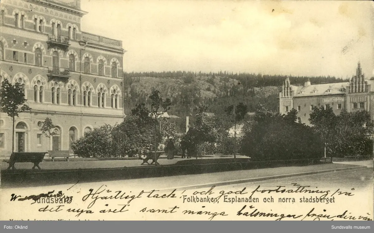 Vykort med motiv över Folkbanken, Esplanaden och Norra Stadsberget i Sundsvall.