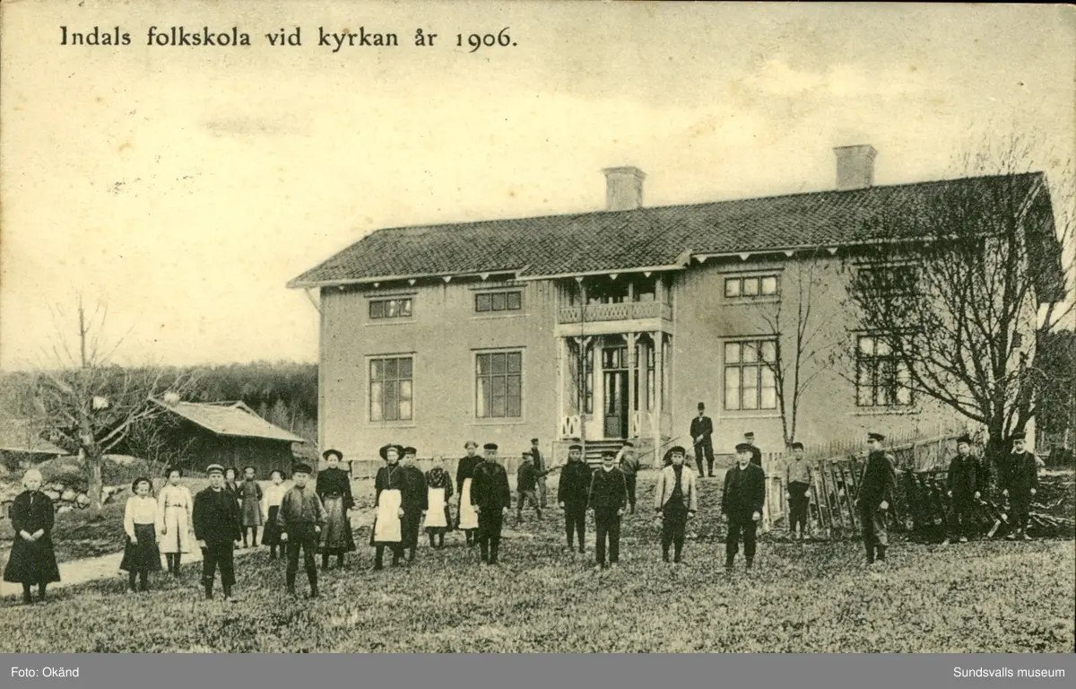 Vykort med motiv över Indals folkskola vid kyrkan.