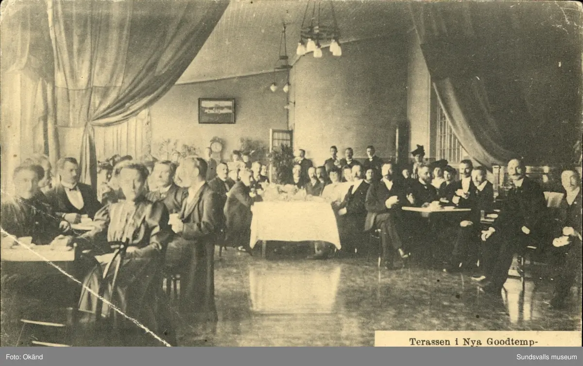 Vykort med motiv över terassen i Nya Godtemplarhuset i Sundsvall.