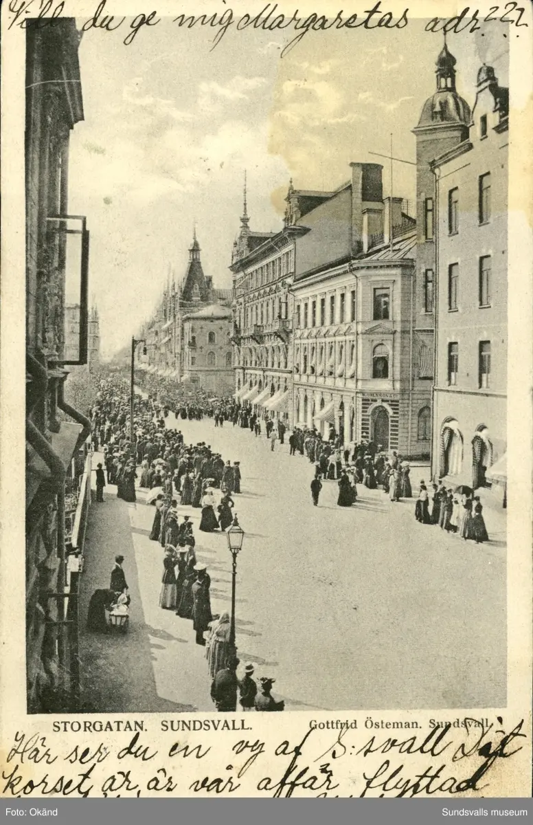 Vykort med motiv över Storgatan i Sundsvall.