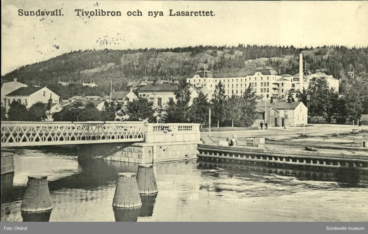 Vykort med motiv över Tivolibron och nya Lasarettet i Sundsvall.