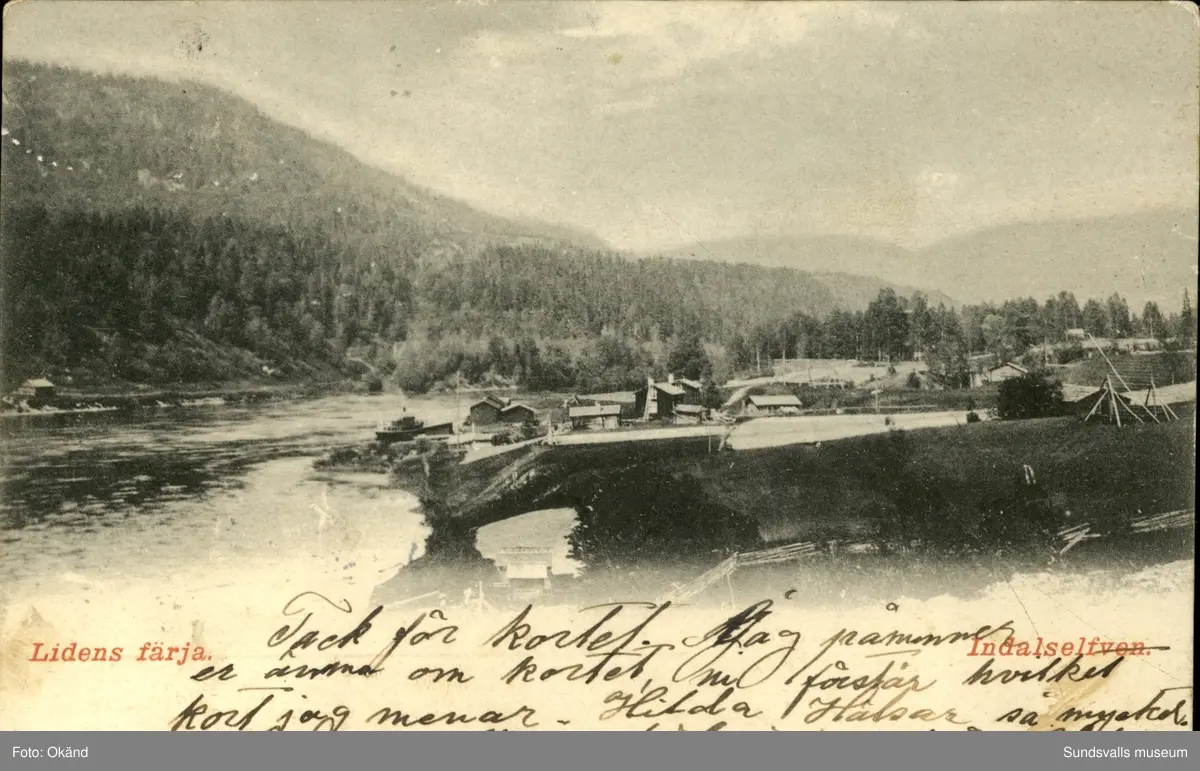 Vykort med motiv över Lidens färja som trafikerade Indalsälven.