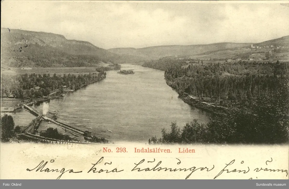 Vykort med motiv över Indalsälven och timmerrännan vid Liden.