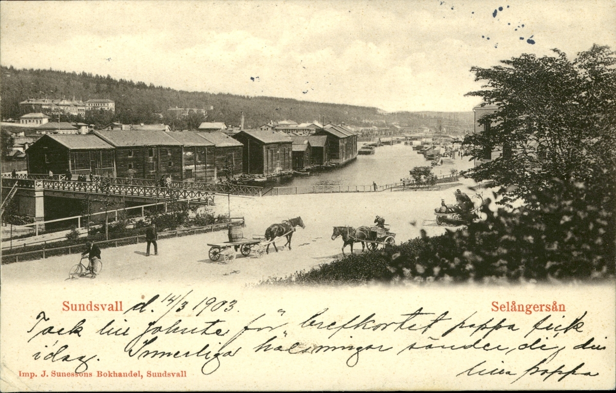 Vykort över Storbron och de gamla trämagasinen invid Selångersån i Sundsvall.