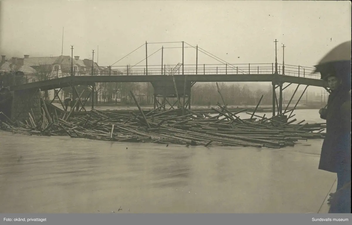 Vykort med motiv över en av broarna vid Selångersån under översvämningarna i Sundsvall 1919.