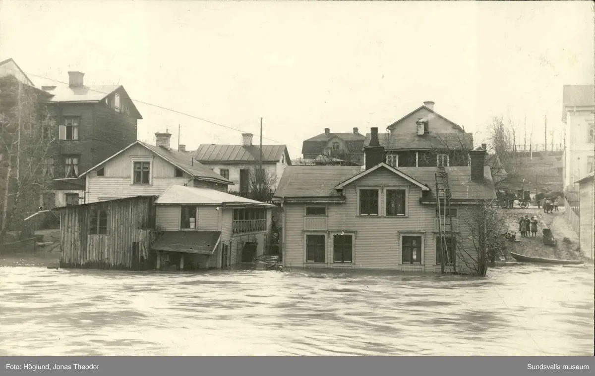 Vykort med motiv av vattennivån i Selångersån vid översvämningarna 1919.