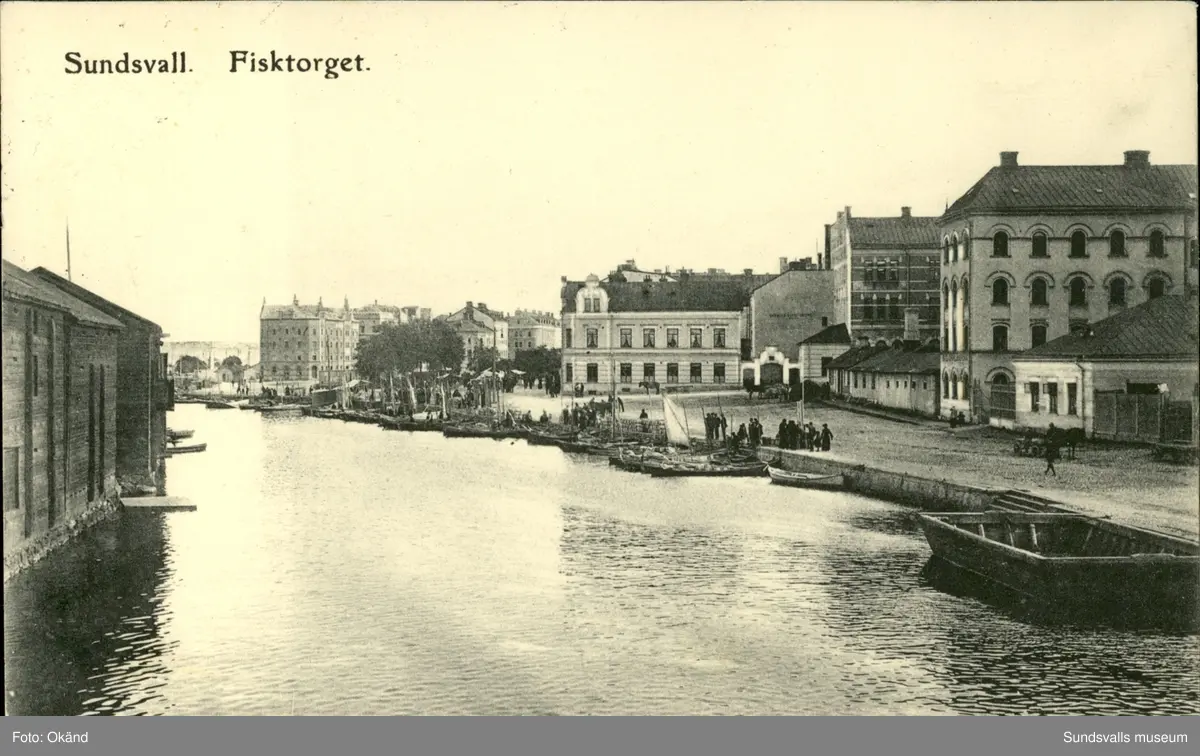 Vykort med motiv över Fisktorget och Selångersån i Sundsvall.