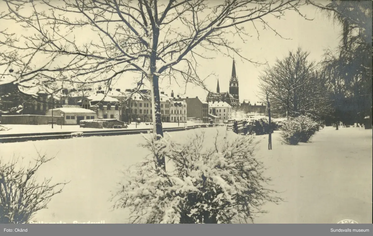 Vykort med vintermotiv över Selångersån med Gustav Adolfs kyrka i bakgrunden.