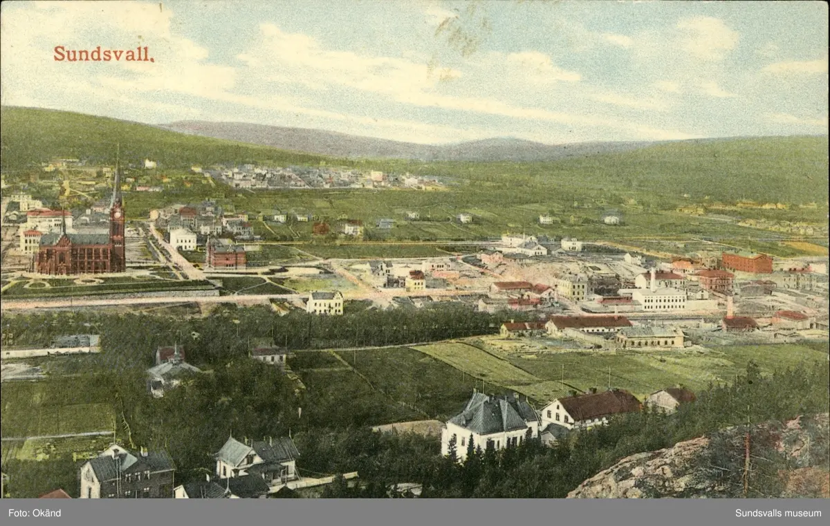 Vykort med motiv över Sundsvall och Gustav Adolfs kyrka.