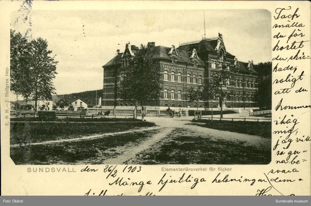 Vykort med motiv över Elementärläroverket för flickor i Sundsvall.