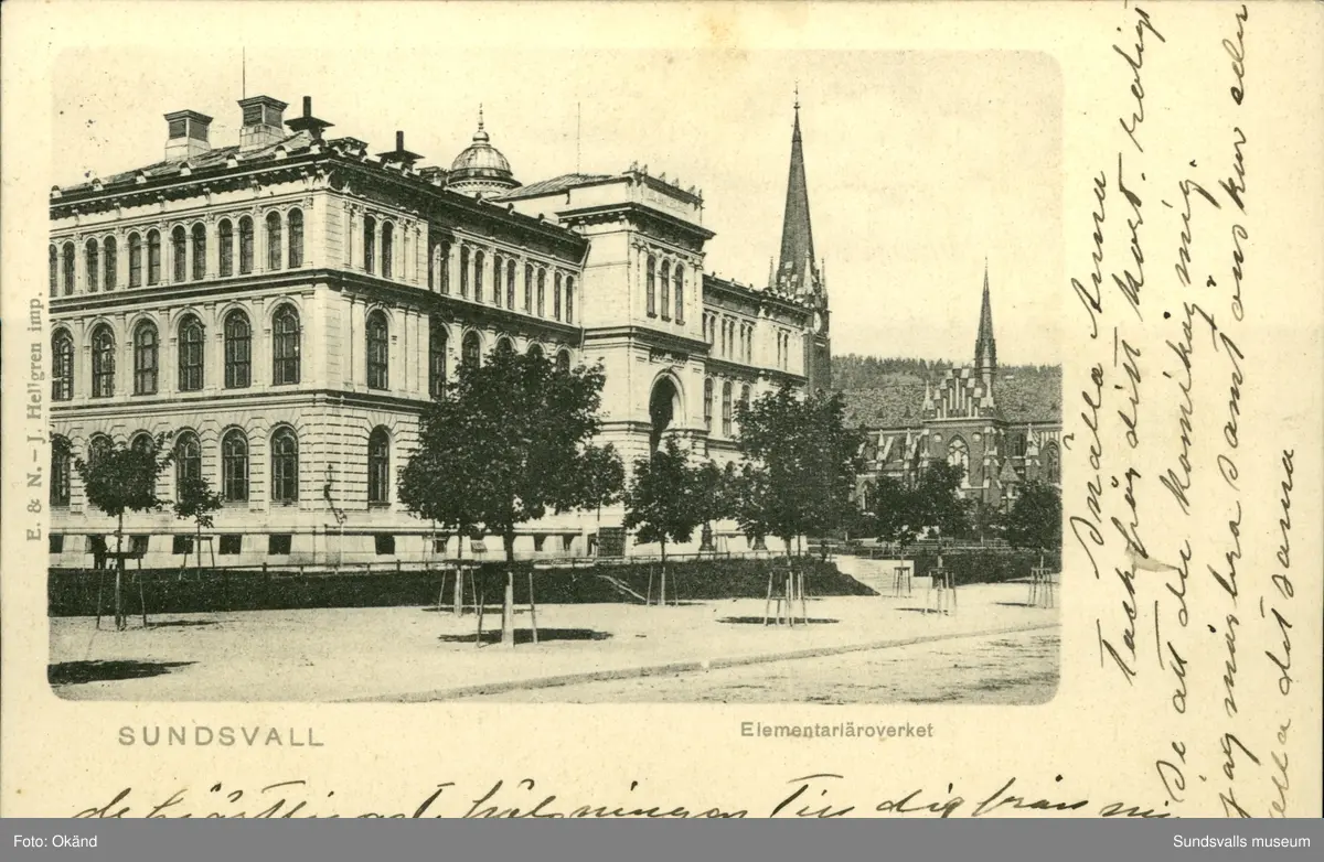 Vykort med motiv över Elementärläroverket i Sundsvall.