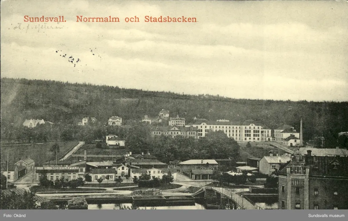 Vykort med motiv över Norrmalm och Stadsbacken i Sundsvall.