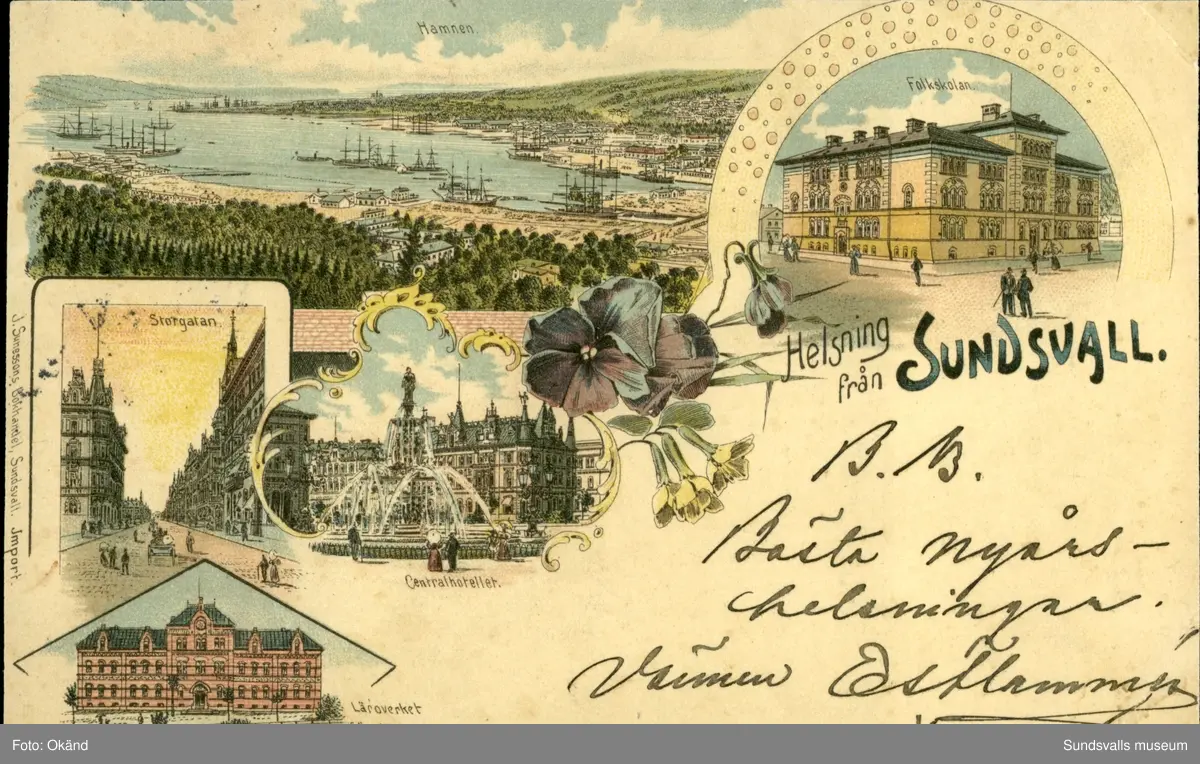 Vykort med motiv över Hamnen, Folkskolan, Storgatan, Centralhotellet och Läroverket för flickor i Sundsvall.