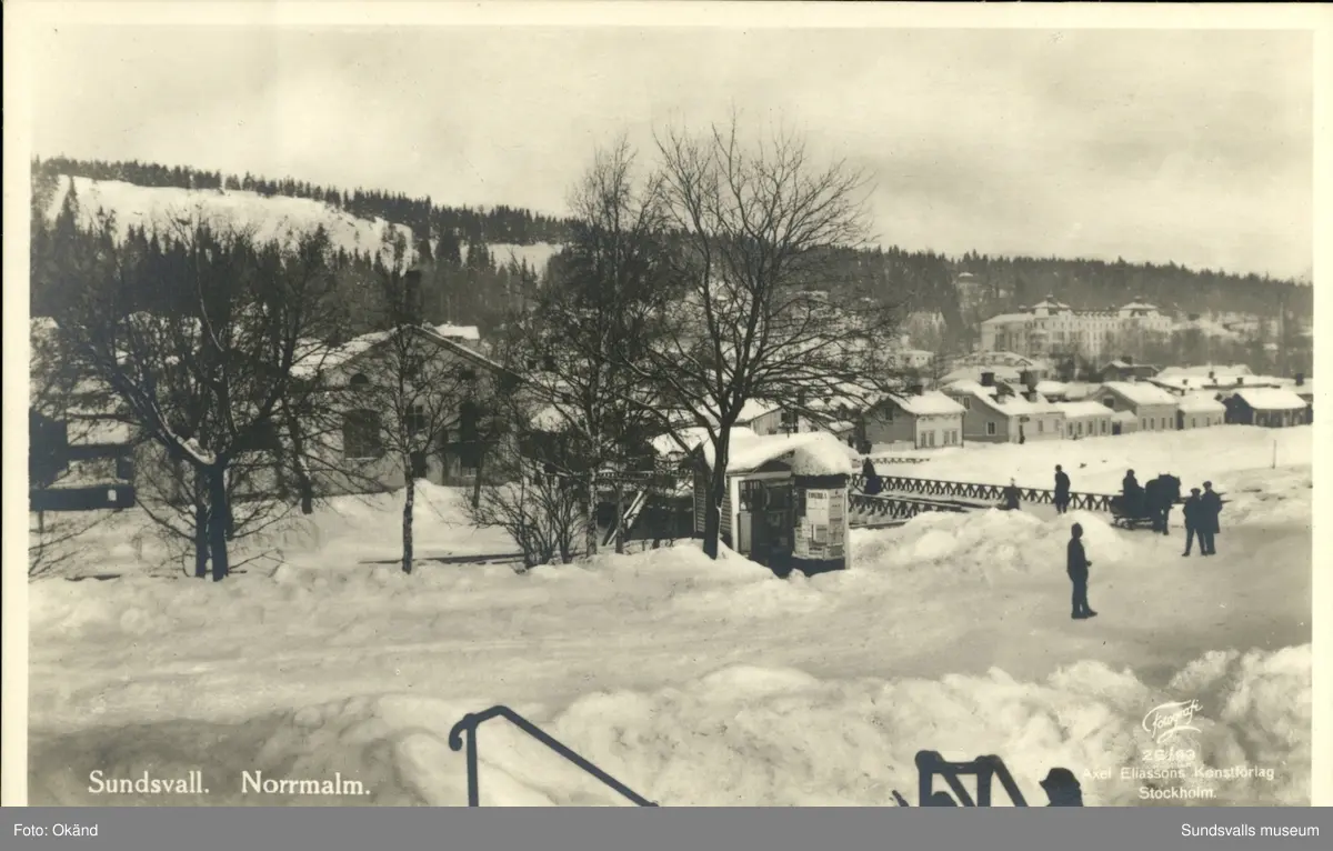 Vykort med vintermotiv över Norrmalm i Sundsvall.