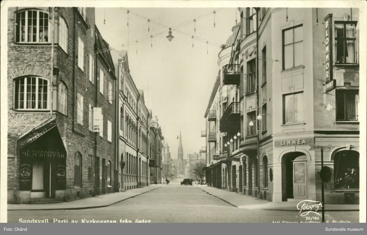 Vykort med motiv över parti av Kyrkogatan i Sundsvall.