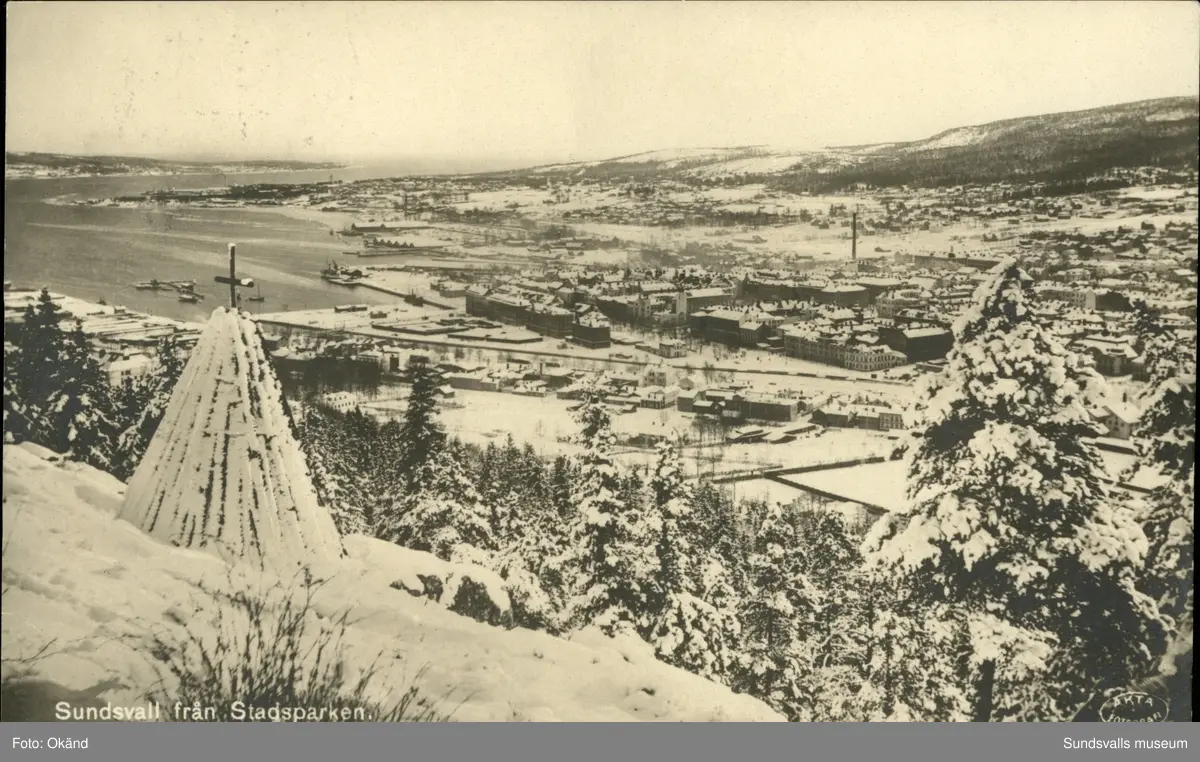 Vykort med motiv över Sundsvall från norra stadsparken.