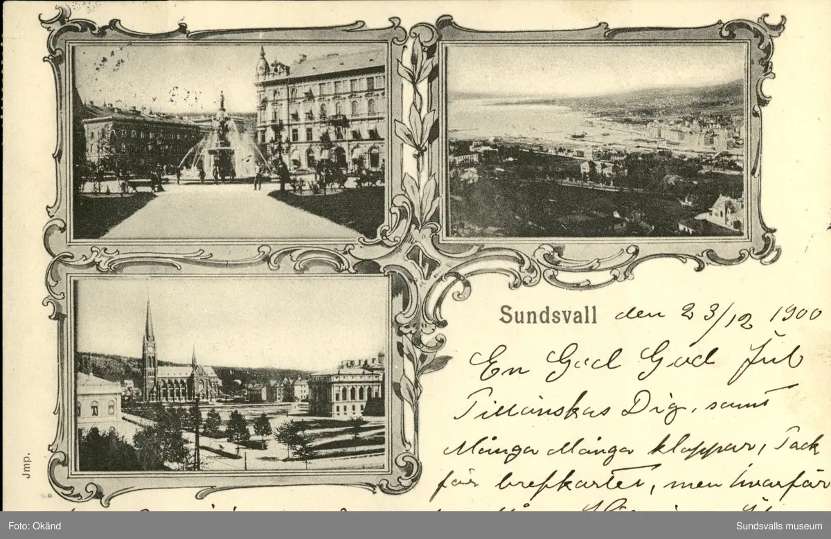 Vykort med motiv infällda av Vängåvan, hamnen och Gustav Adolfs kyrka i Sundsvall.