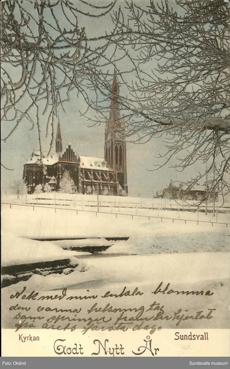 Vykort med vintermotiv av Gustav Adolfskyrka i Sundsvall och texten Godt Nytt År.