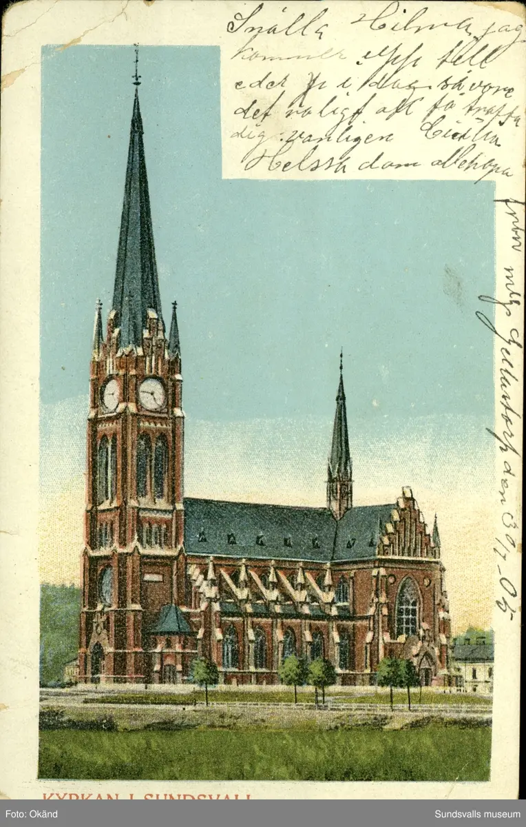 Vykort med motiv över Gustav Adolfs kyrka i Sundsvall.