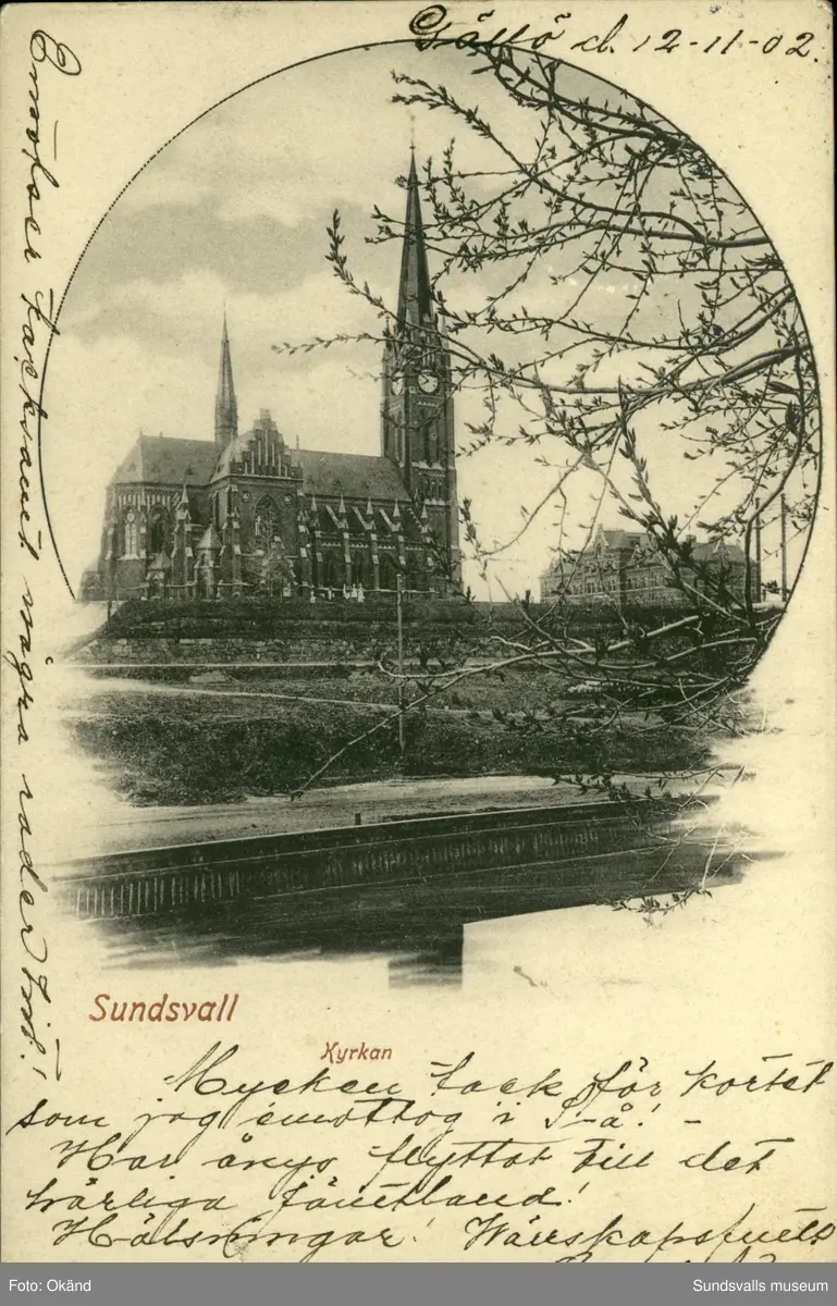 Vykort med motiv på Gustav Adolfskyrka i Sundsvall.