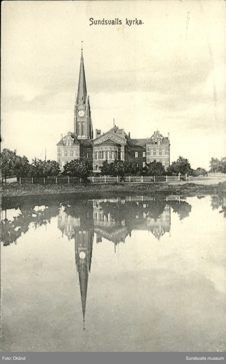 Vykort med motiv över Gustav Adolfs kyrka i Sundsvall.